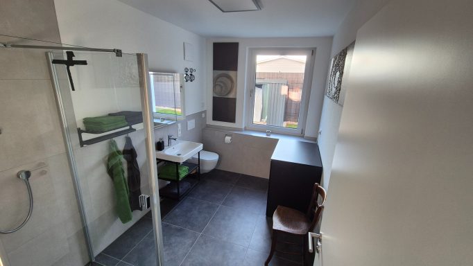 Im modern gestalteten Bad finden Sie eine ebenerdige Dusche, ausreichend Hand- und Duschtücher sowie neben einem Föhn auch eine Waschmaschine zur Benutzung.
