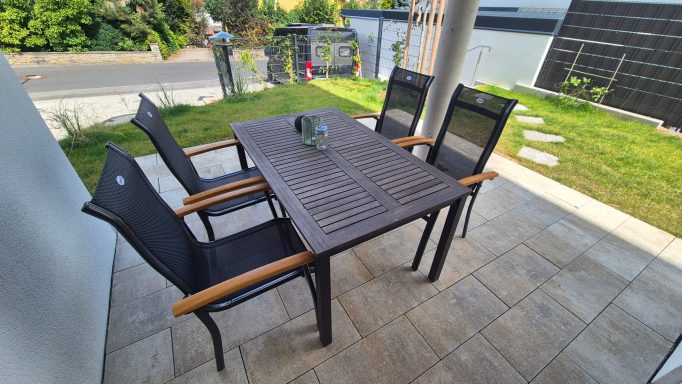 Auf der überdachten Terrasse steht eine gemütliche Essgruppe für Sie bereit – Ihr persönlicher Garten mit Liegestühlen lädt zum Entspannen ein.