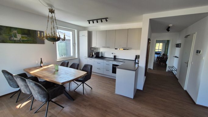 Nach Betreten der Wohnung kommen Sie in einen großzügigen Wohn-Essbereich mit komplett ausgestatteter Küche - speziell gefiltertes Trinkwasser steht jederzeit zur Verfügung.